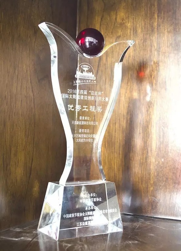 2月27日,2016第四界“迈能杯”国际太阳能建筑创新应用大赛颁奖典礼于北京落幕,天普新能源科技有限公司的大兴区榆垡镇定向安置房太阳能热水项目荣获2016第四届“迈能杯”国际太阳能建筑创新应用大赛优秀工程奖。