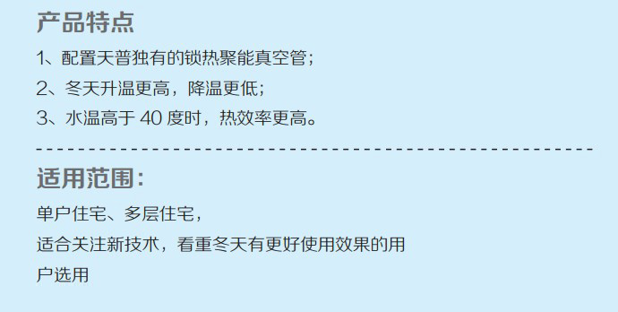 1 、天普太阳能热水器主机(水箱、支架)免费保修三年;工程系统,天普易生活内置浮球箱免费保修一年。保修期自用户购机日期开始计算,保修期限内因产品质量问题出现故障,一律由经销商或服务商为用户提供免费服务。