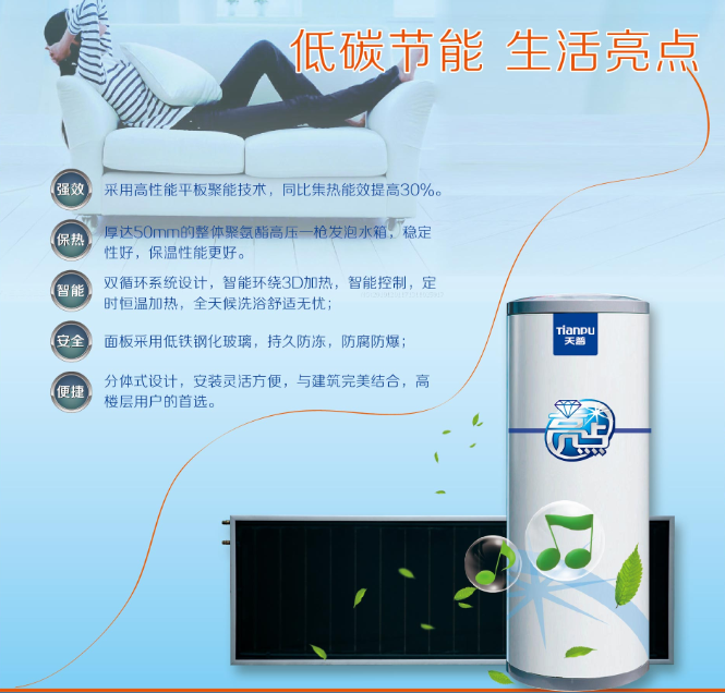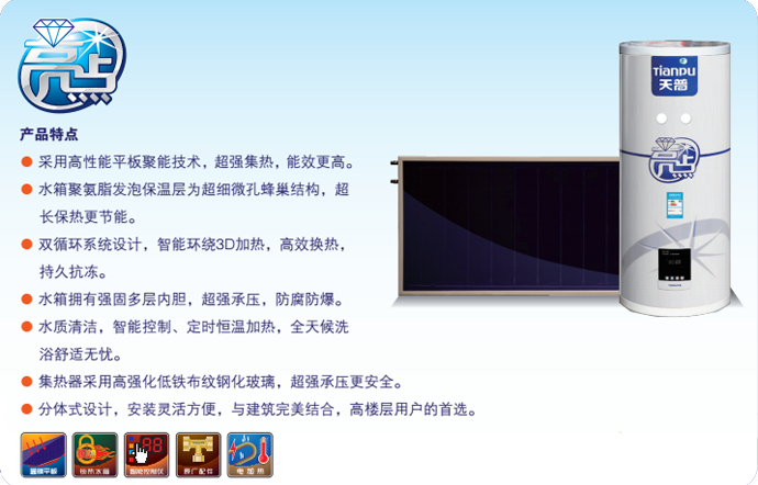 1 、天普太阳能热水器主机(水箱、支架)免费保修三年;工程系统,天普易生活内置浮球箱免费保修一年。保修期自用户购机日期开始计算,保修期限内因产品质量问题出现故障,一律由经销商或服务商为用户提供免费服务。